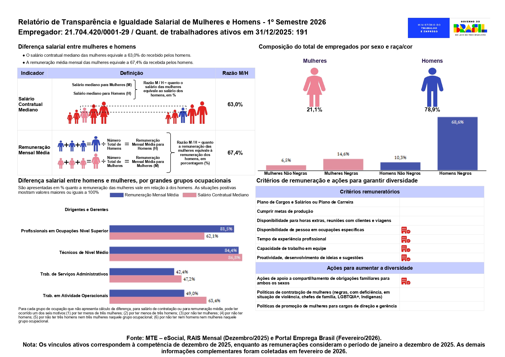O relatório é elaborado com base nas informações constantes do eSocial, RAIS e nos dados complementares prestados pela empresa no Portal Emprega Brasil, observada a legislação vigente e a proteção de dados pessoais, em conformidade com a Lei Geral de Proteção de Dados Pessoais (Lei nº 13.709/2018).